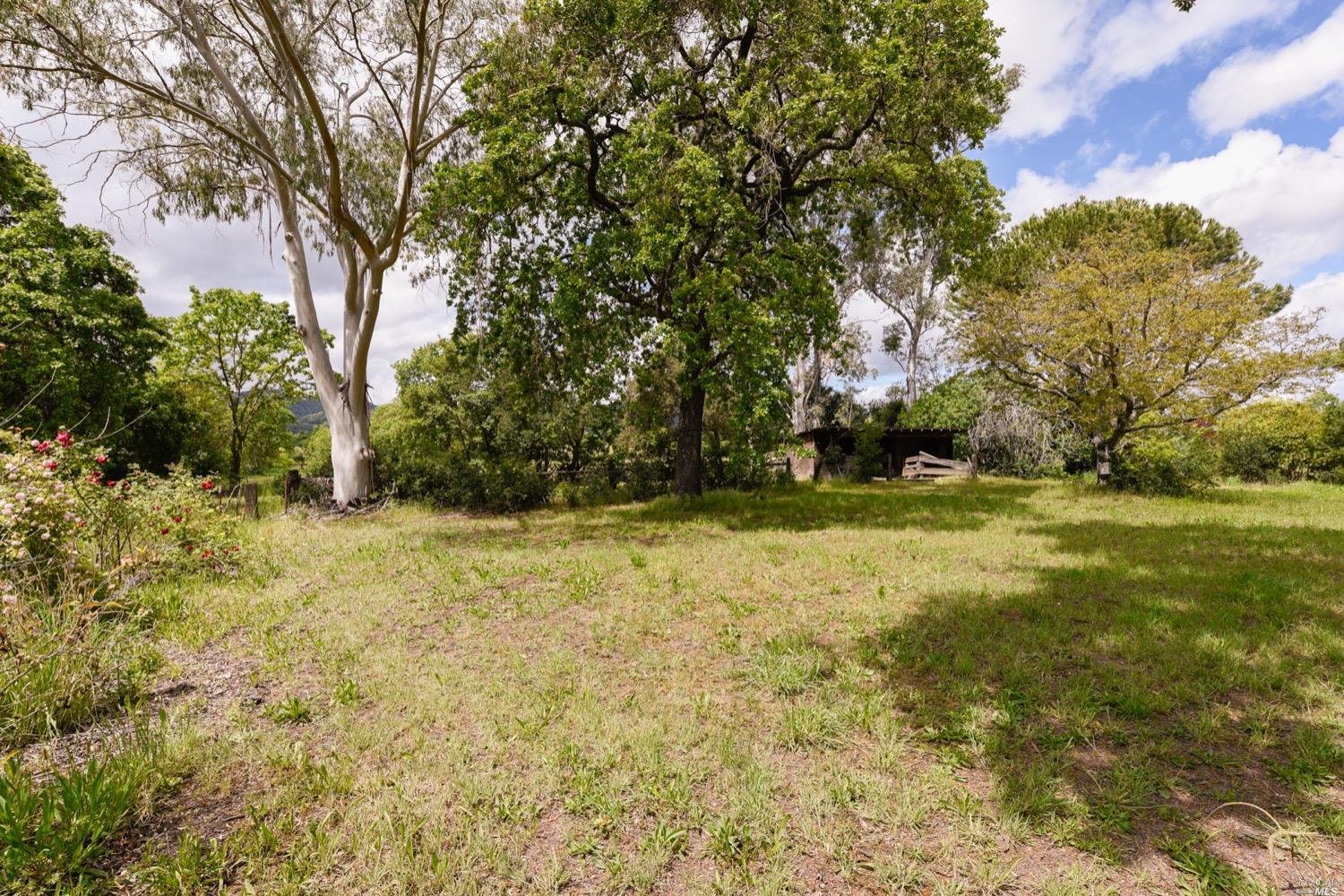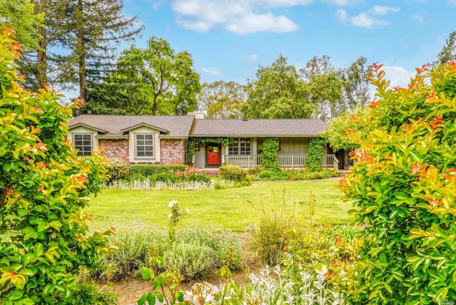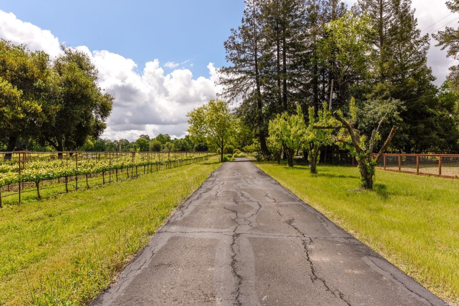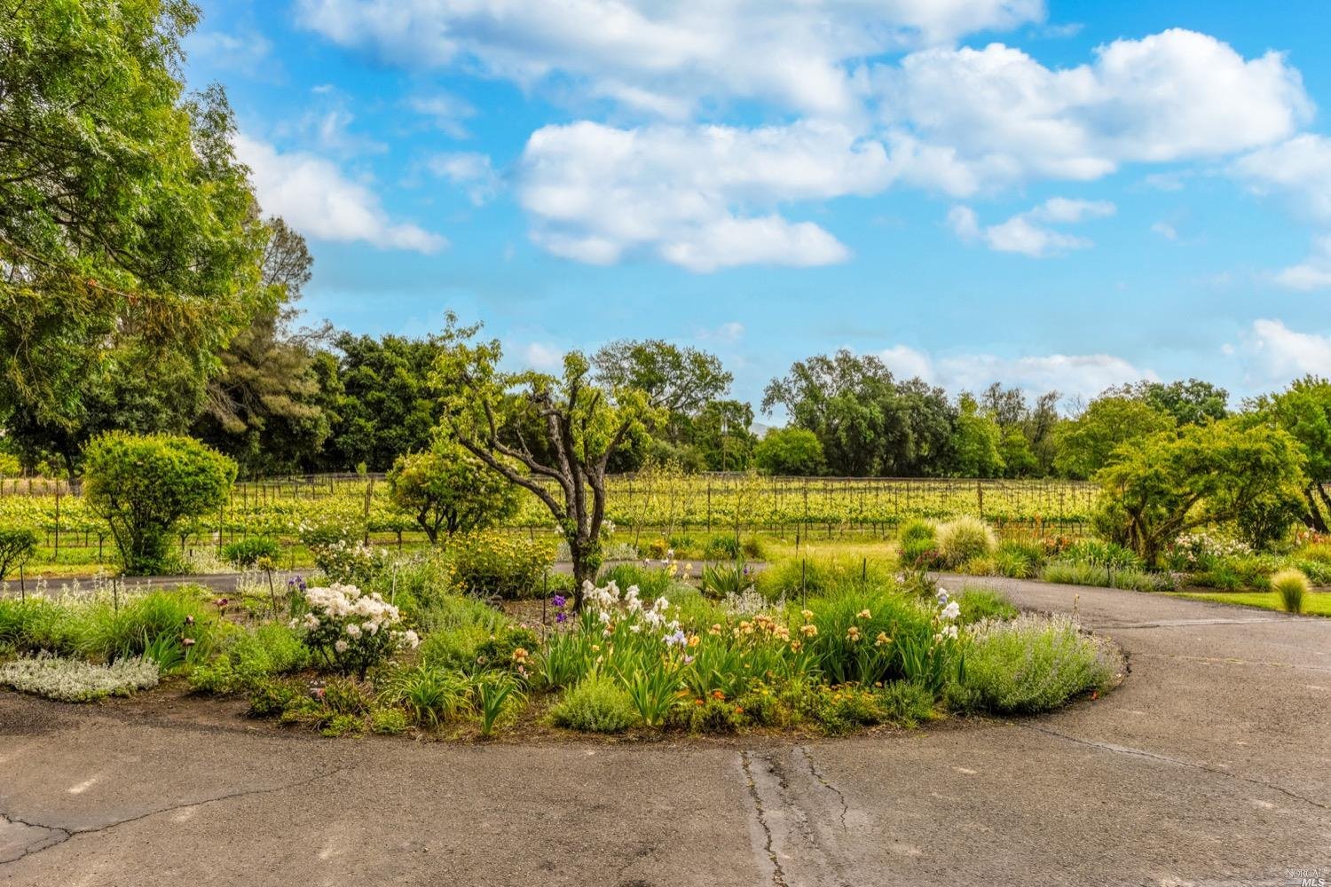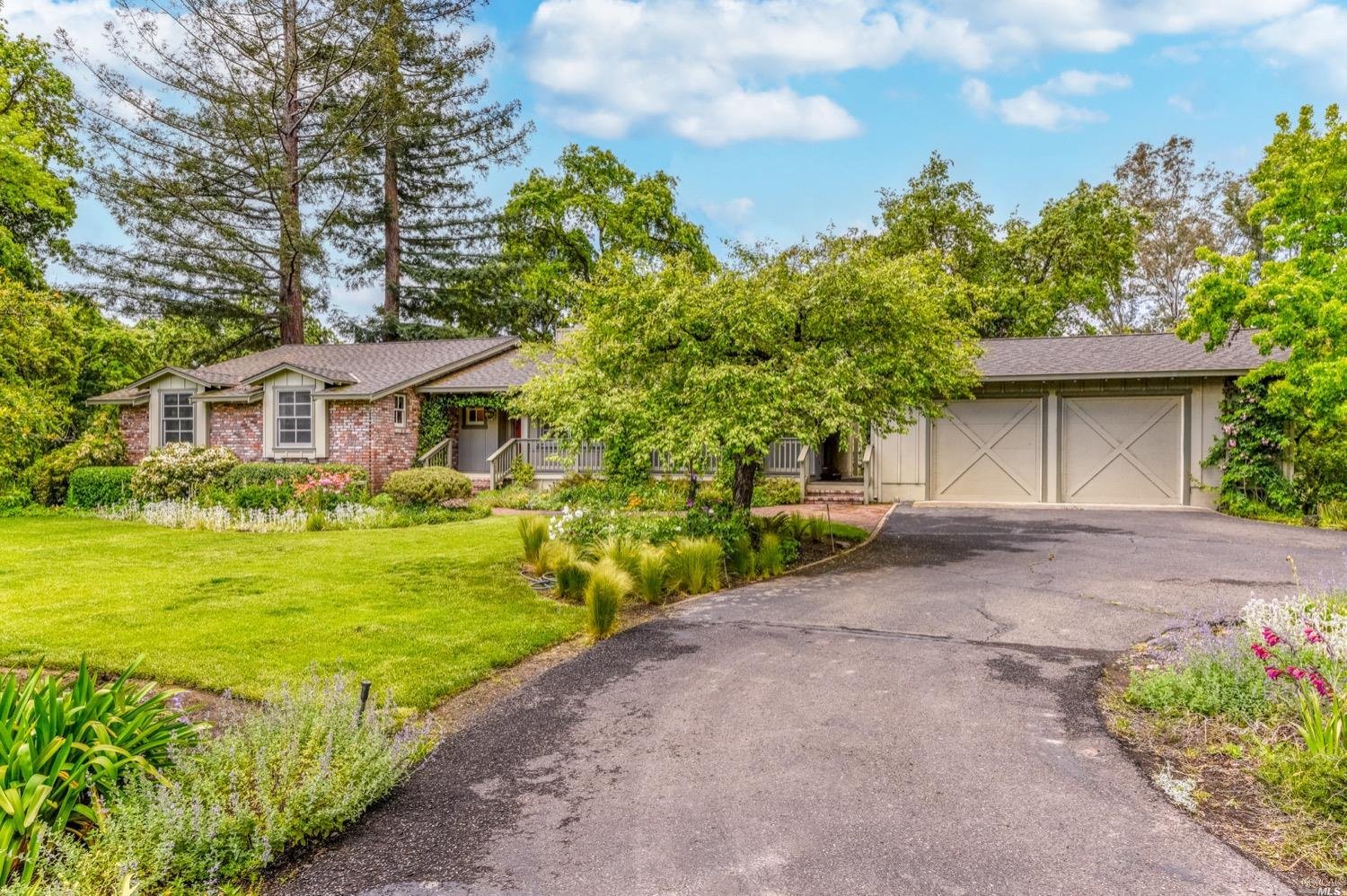 This is the Napa Valley setting you've been waiting for. Located on a private 4.7+/- level, usable acres, this desirable flag lot with paved access and circular drive has a charming 2,394+/- sqft 4 bedroom, 2 bath single-level home with endless possibilities. Vaulted ceilings with exposed beams and French doors give a sense of space. Living room with lovely stone fireplace with adjoining formal dining room adds charm to this unique offering. Well-equipped galley kitchen with window seat looking out to covered front porch, lush landscape, and adjacent vineyards.
