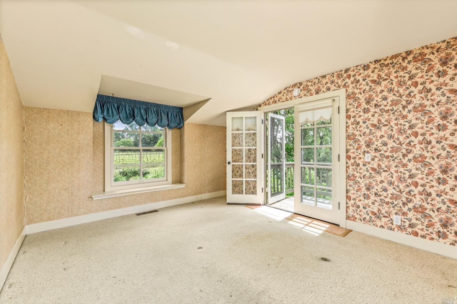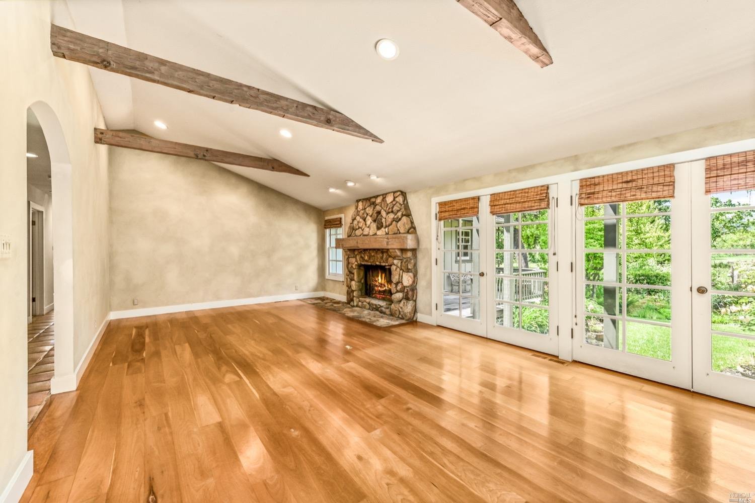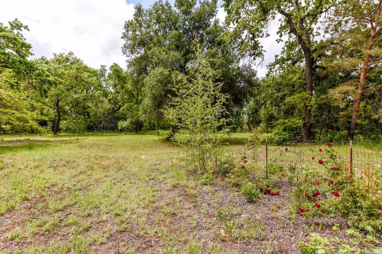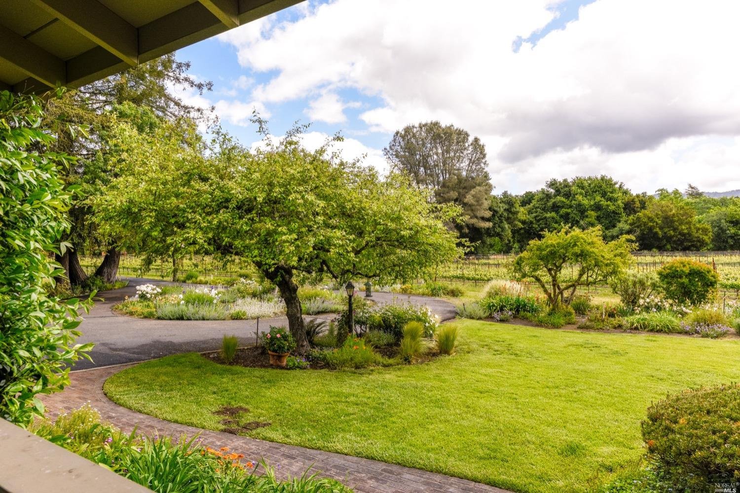 This is the Napa Valley setting you've been waiting for. Located on a private 4.7+/- level, usable acres, this desirable flag lot with paved access and circular drive has a charming 2,394+/- sqft 4 bedroom, 2 bath single-level home with endless possibilities. Vaulted ceilings with exposed beams and French doors give a sense of space. Living room with lovely stone fireplace with adjoining formal dining room adds charm to this unique offering. Well-equipped galley kitchen with window seat looking out to covered front porch, lush landscape, and adjacent vineyards.