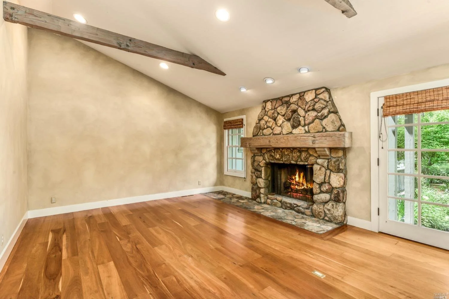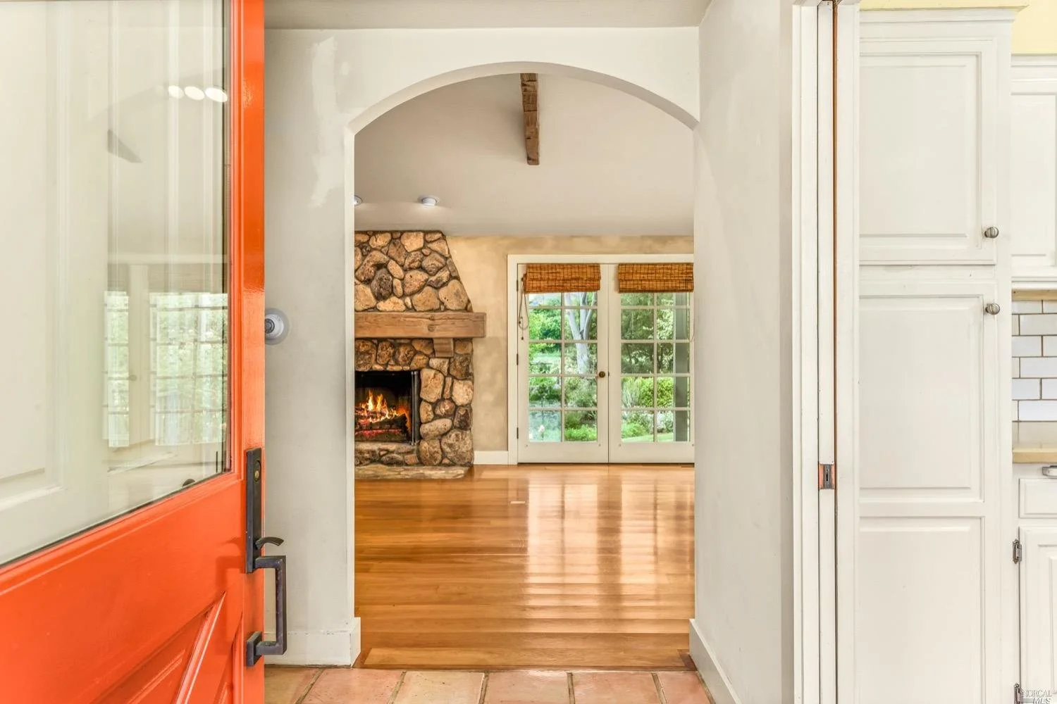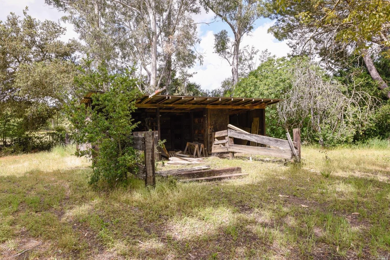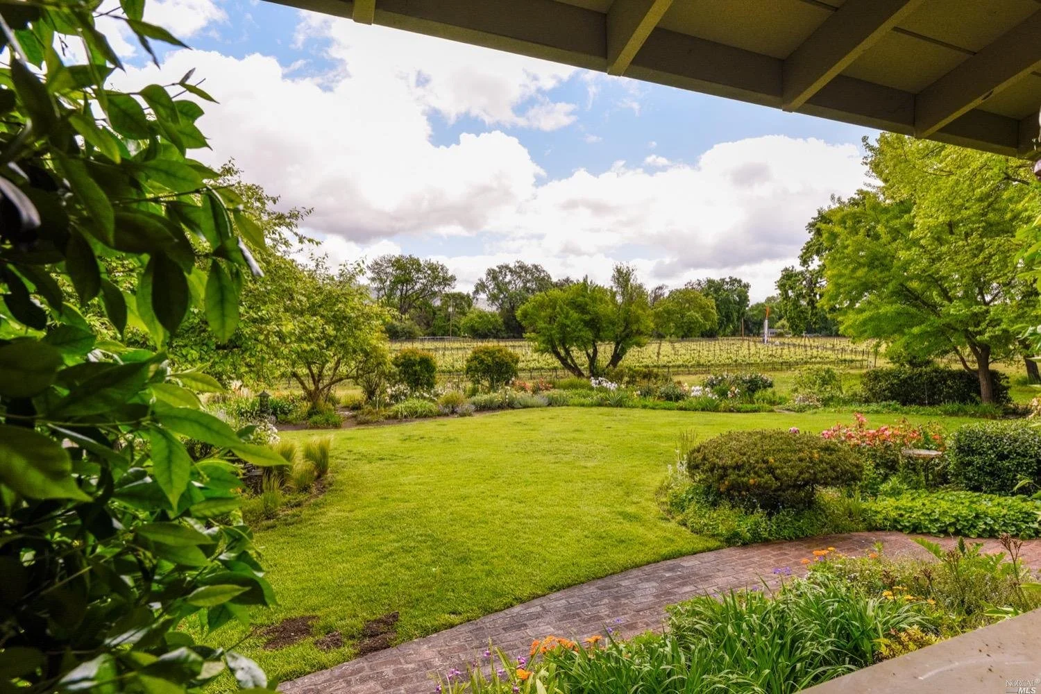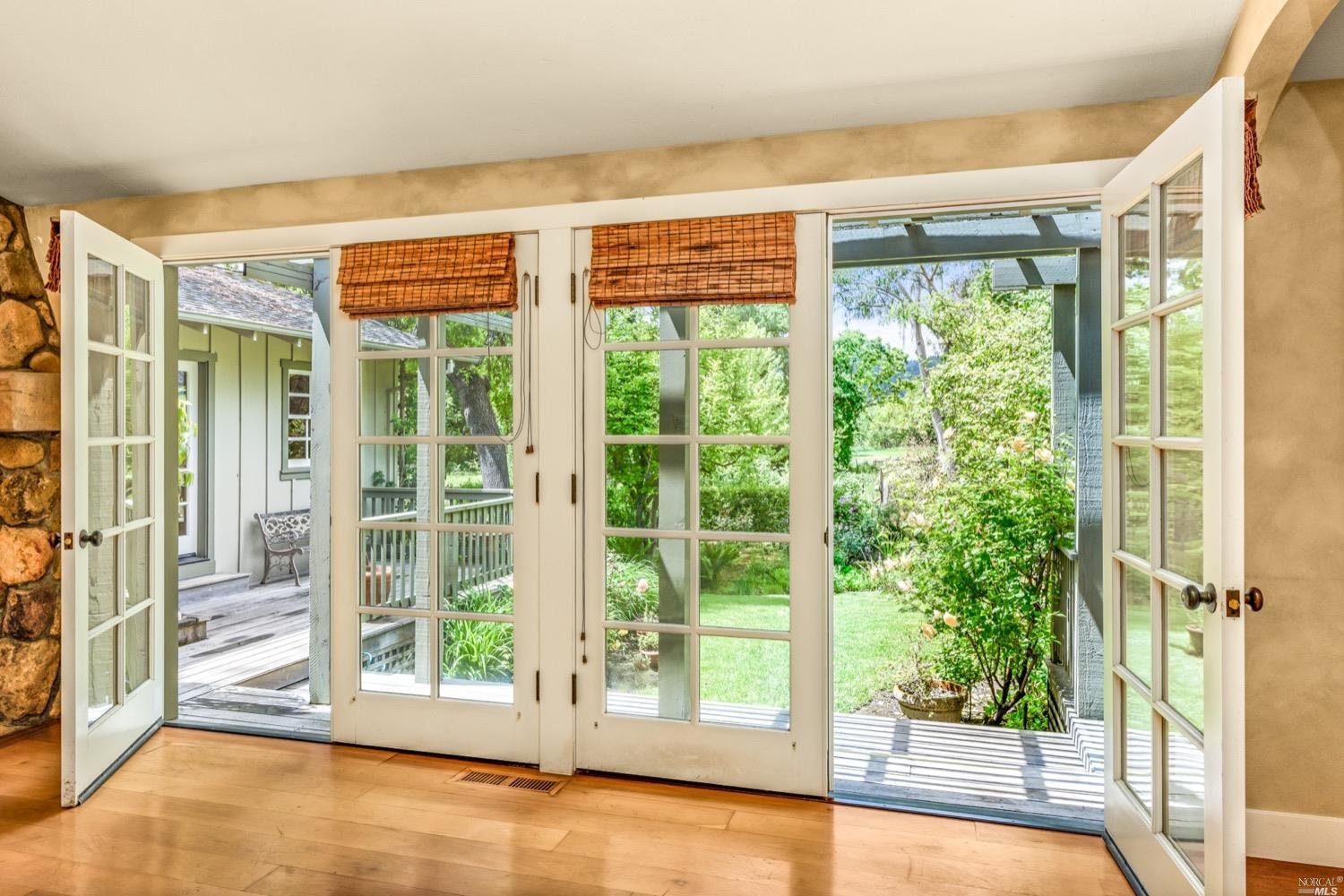 This is the Napa Valley setting you've been waiting for. Located on a private 4.7+/- level, usable acres, this desirable flag lot with paved access and circular drive has a charming 2,394+/- sqft 4 bedroom, 2 bath single-level home with endless possibilities. Vaulted ceilings with exposed beams and French doors give a sense of space. Living room with lovely stone fireplace with adjoining formal dining room adds charm to this unique offering. Well-equipped galley kitchen with window seat looking out to covered front porch, lush landscape, and adjacent vineyards.