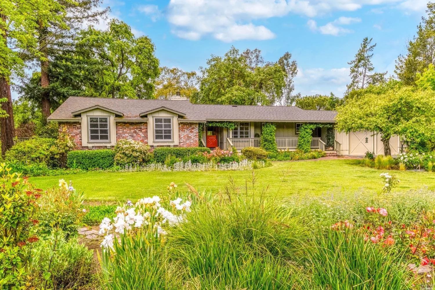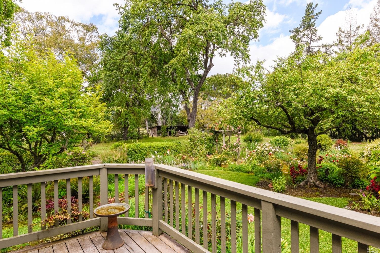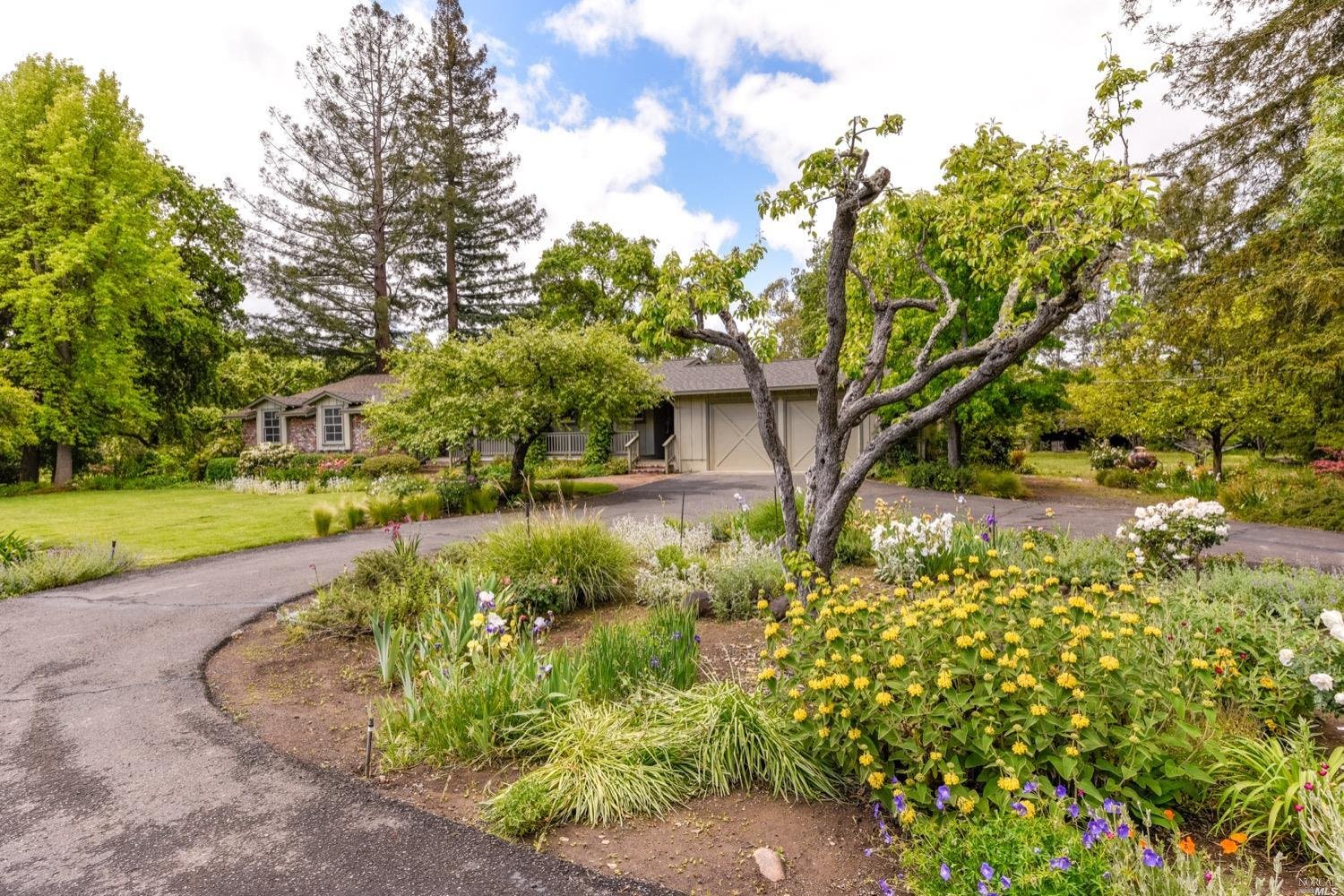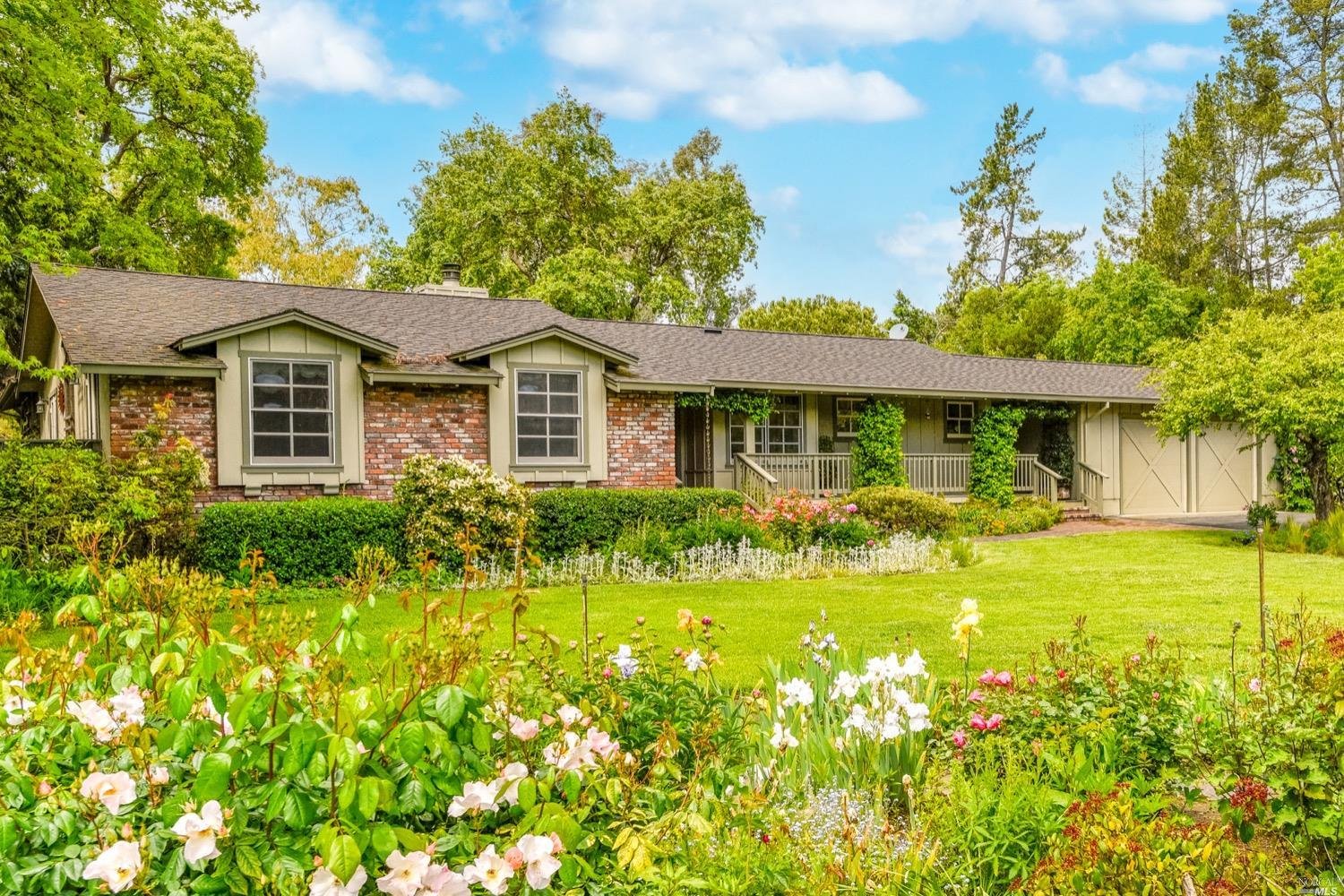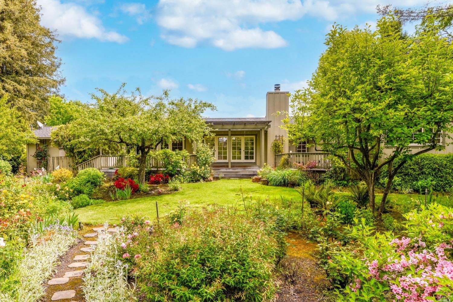 There are three guest bedrooms and a fourth oversized bedroom with vaulted ceilings, views of grounds which lends itself to a possible art studio, home office, or master suite. There are two full baths as well as an indoor laundry room. rear deck area is great for entertaining and has views of the lush rear garden with extensive plantings and mature trees. There is a covered attached breezeway with access to oversized two car garage. Seasonal creek borders the rear of the property. Central heat/air. Minutes to downtown Napa, Yountville and more.