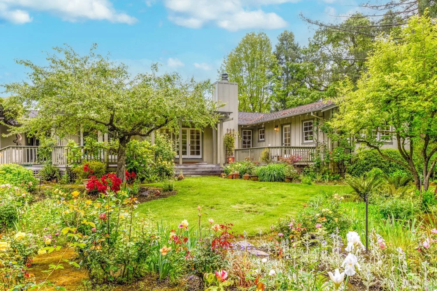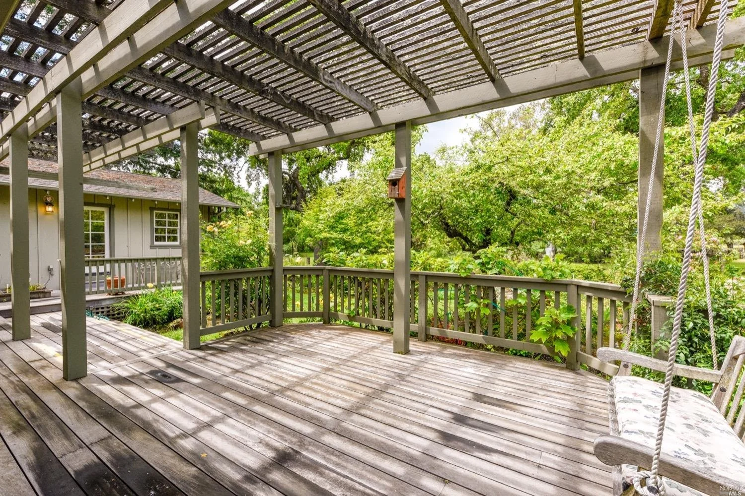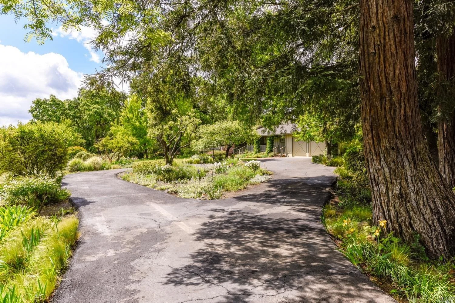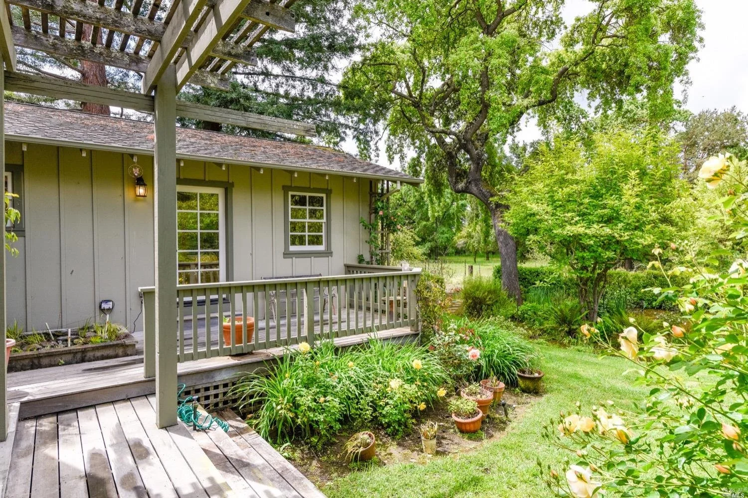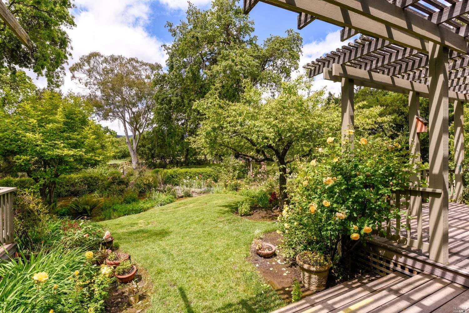 There are three guest bedrooms and a fourth oversized bedroom with vaulted ceilings, views of grounds which lends itself to a possible art studio, home office, or master suite. There are two full baths as well as an indoor laundry room. rear deck area is great for entertaining and has views of the lush rear garden with extensive plantings and mature trees. There is a covered attached breezeway with access to oversized two car garage. Seasonal creek borders the rear of the property. Central heat/air. Minutes to downtown Napa, Yountville and more.