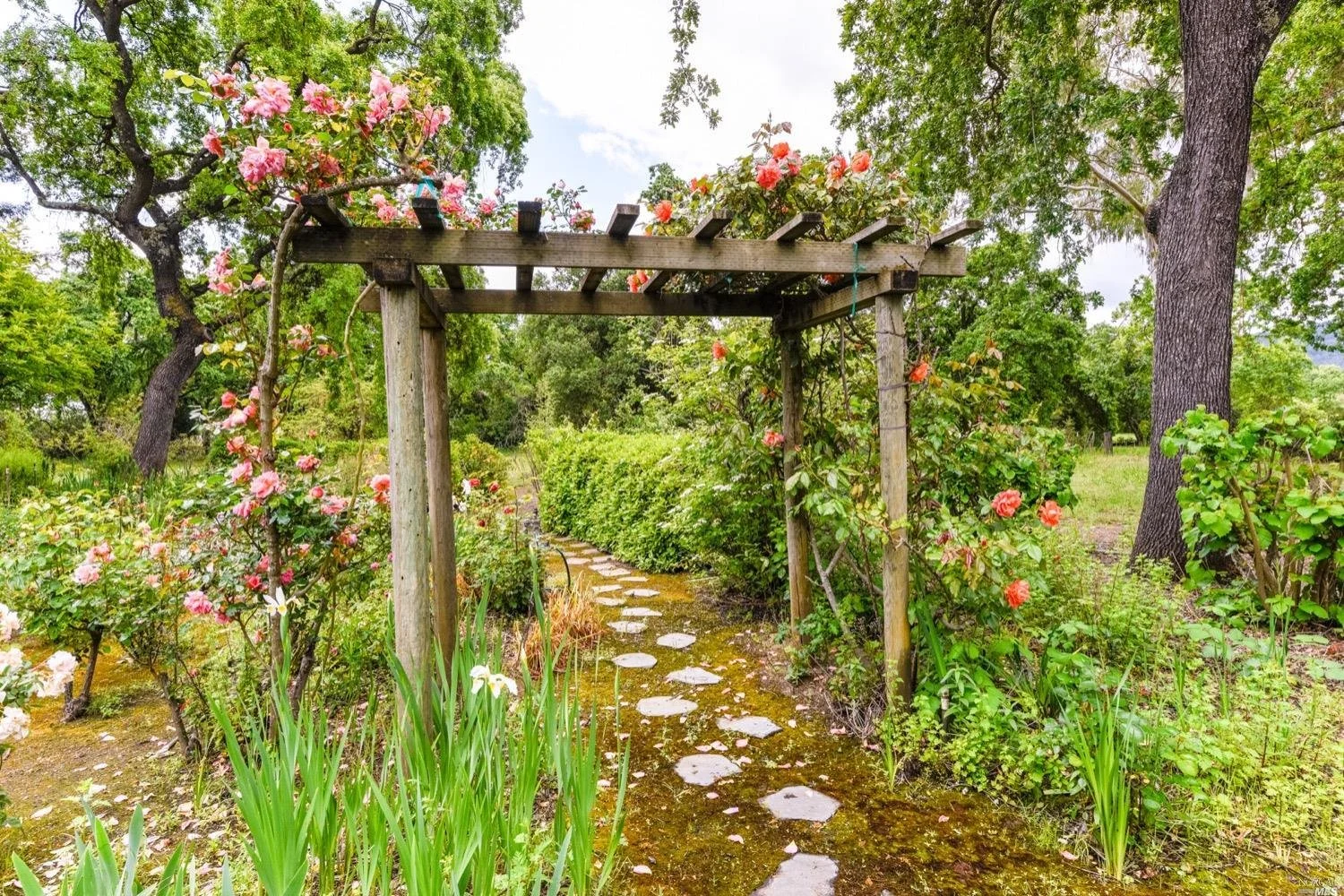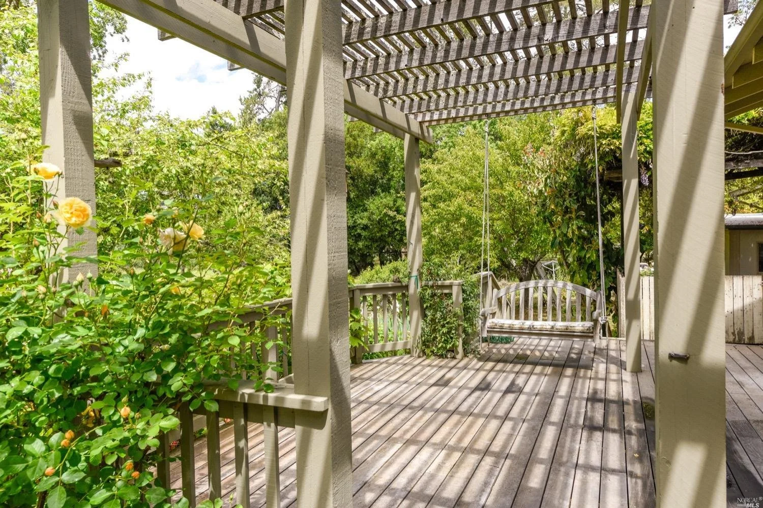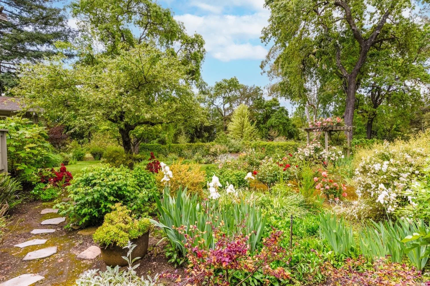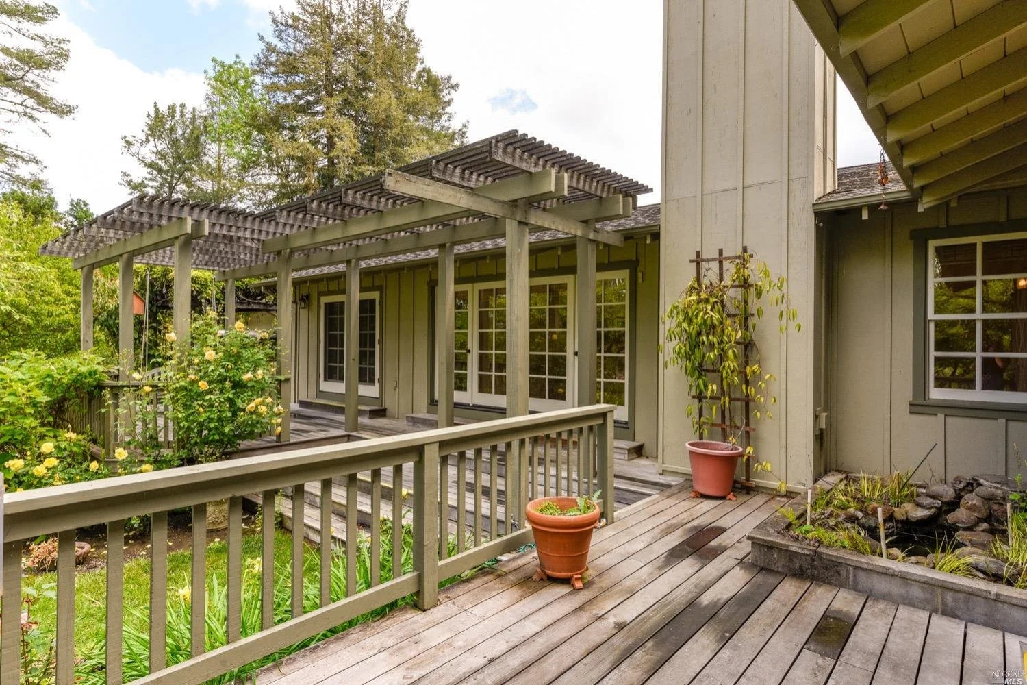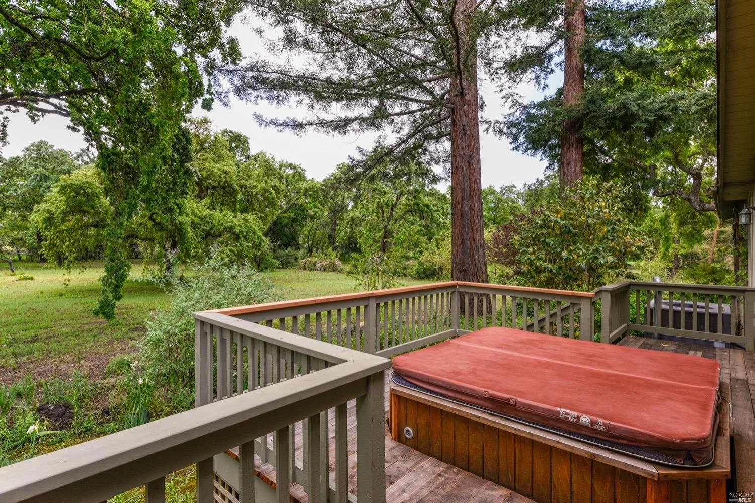 There are three guest bedrooms and a fourth oversized bedroom with vaulted ceilings, views of grounds which lends itself to a possible art studio, home office, or master suite. There are two full baths as well as an indoor laundry room. rear deck area is great for entertaining and has views of the lush rear garden with extensive plantings and mature trees. There is a covered attached breezeway with access to oversized two car garage. Seasonal creek borders the rear of the property. Central heat/air. Minutes to downtown Napa, Yountville and more.