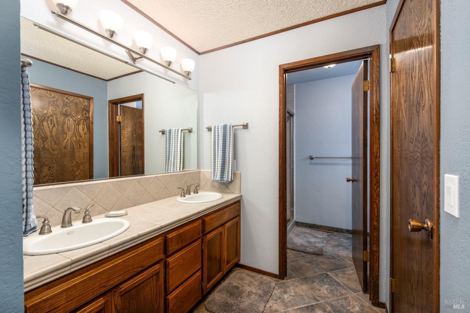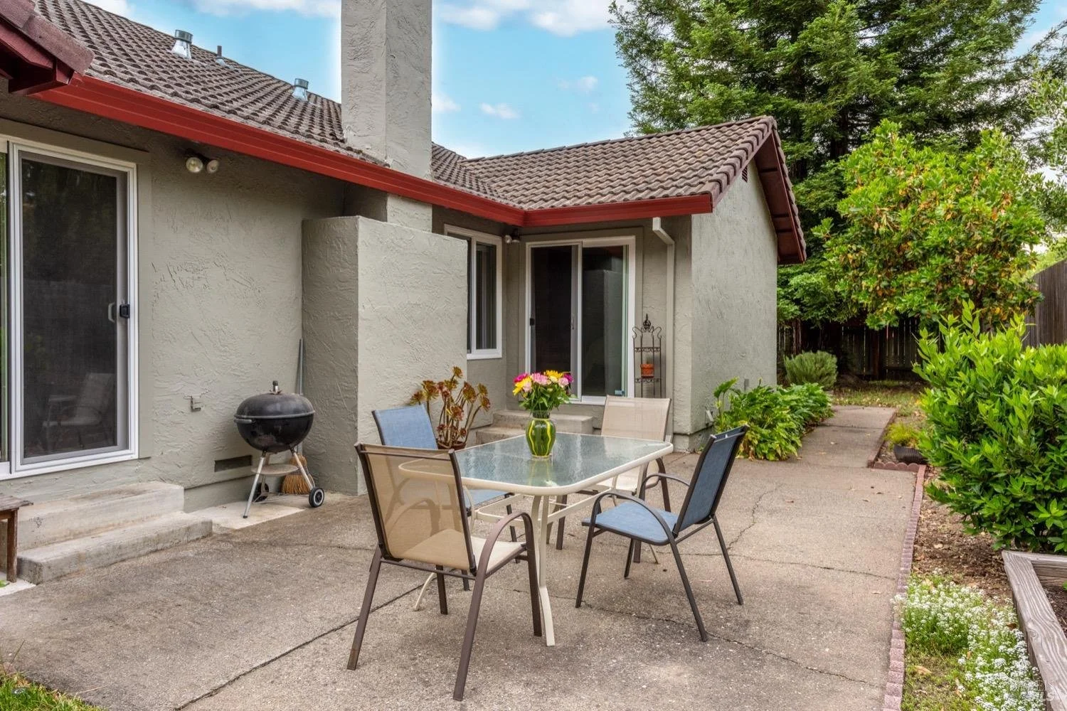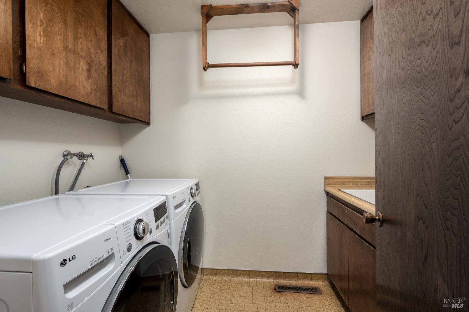 Primary bedroom is generous in size w/ensuite bath, walk in closet and slider to rear yard patio. Two additional guest bedrooms and guest bath at hall along with full size laundry room w/cabinetry and sink.