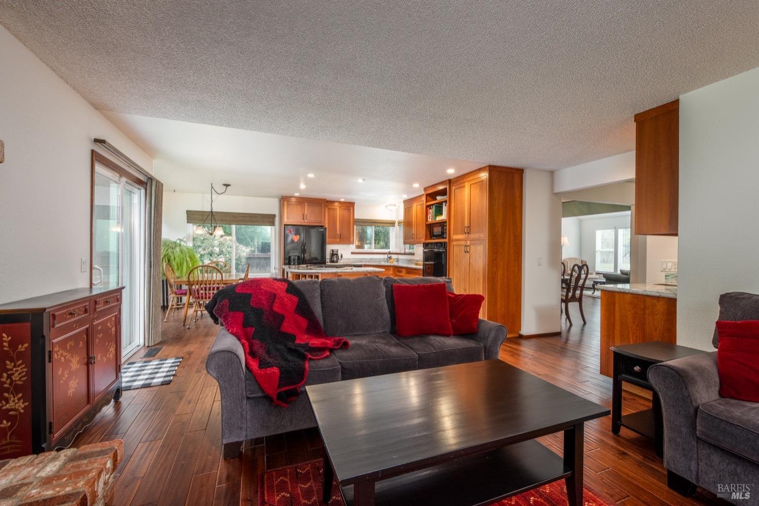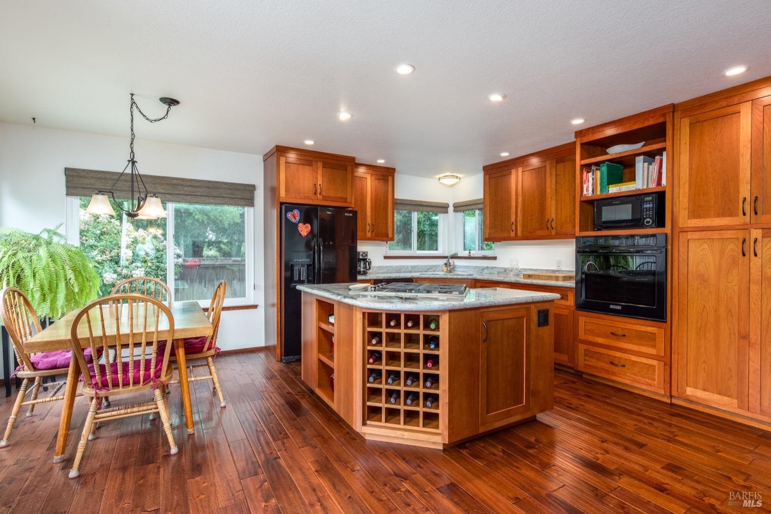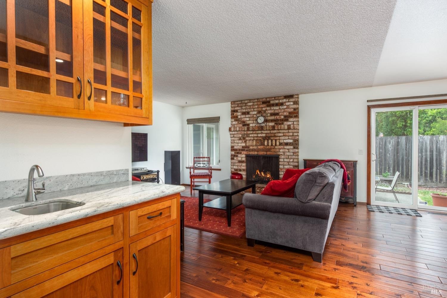 Location Location! This lovely single level home sits at the end of a quiet street and is sure to impress. Entry opens to living room, dining room combo w/vaulted ceiling and rich wood flooring which extends to kitchen and family room. No expense spared in the custom kitchen remodel which includes cherrywood cabinets, granite slab counters, recessed lighting and island w/gas cooktop and breakfast area. Adjacent family room with floor to ceiling brick fireplace and lots of natural light and slider to rear yard and patio.