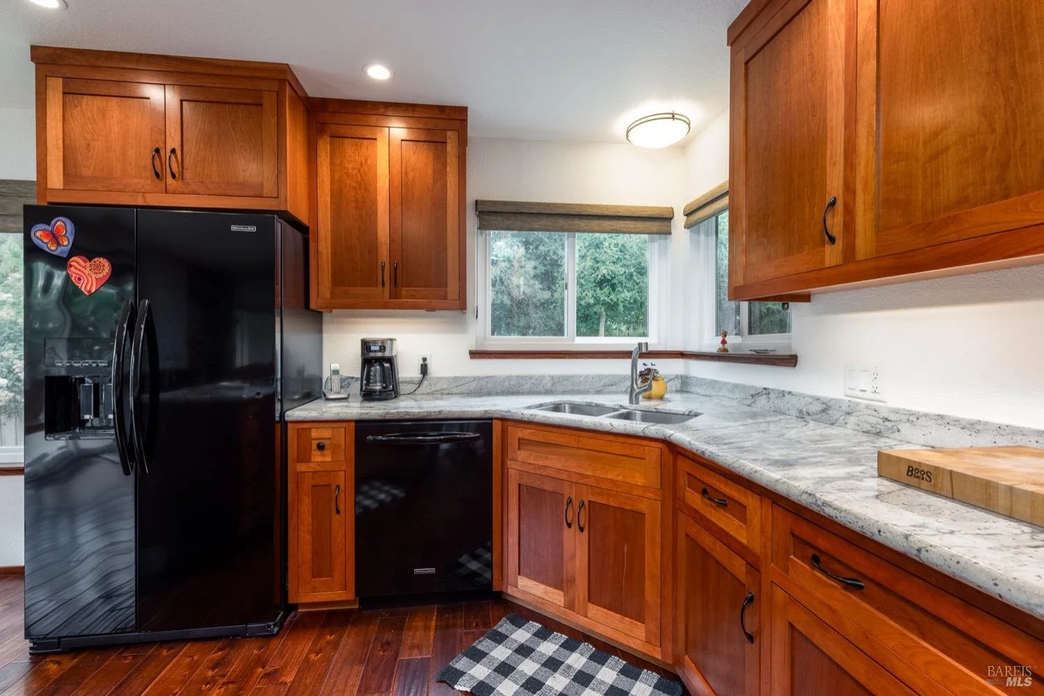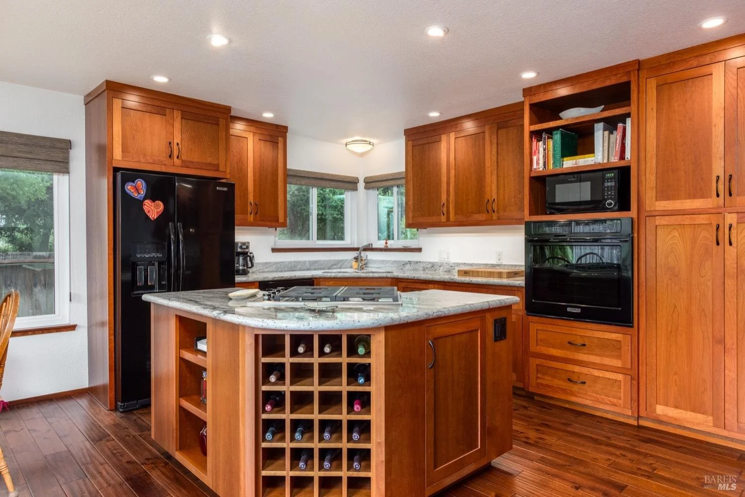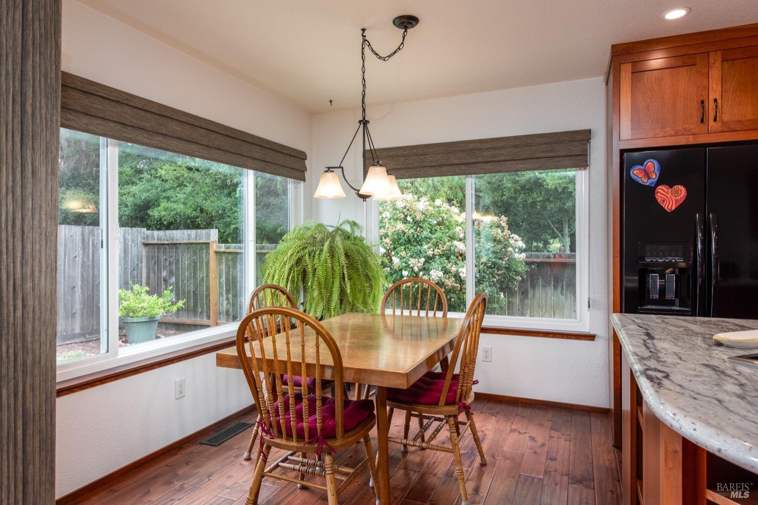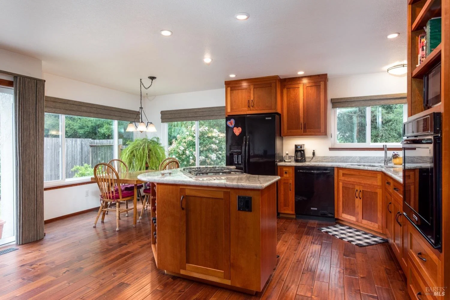 Location Location! This lovely single level home sits at the end of a quiet street and is sure to impress. Entry opens to living room, dining room combo w/vaulted ceiling and rich wood flooring which extends to kitchen and family room. No expense spared in the custom kitchen remodel which includes cherrywood cabinets, granite slab counters, recessed lighting and island w/gas cooktop and breakfast area. Adjacent family room with floor to ceiling brick fireplace and lots of natural light and slider to rear yard and patio.